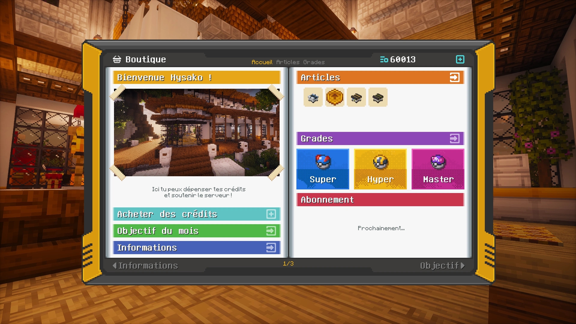 Nous proposons 3 grades déblocables à vie en jeu contre des crédits: Super (environ 30€), Hyper (environ 60€) et Master (environ 90€).